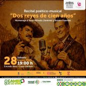 El sábado 28 de marzo, a las 19:00 h, se presenta el recital poético-musical "Dos reyes de cien años", como homenaje a José Alfredo Jiménez y Rubén Fuentes, dos grandes de la música mexicana. Entrada libre, cupo limitado...
